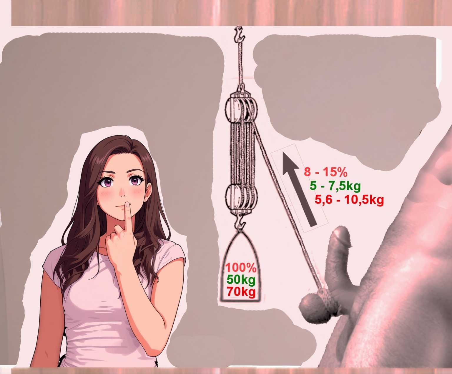Tahle hra je prostě sranda. Takže milé dámy, už jste se někdy houpaly na koulích? Že né? Pak je pravý čas to napravit. Vše je jednodušší než se zdá ale chce to již nějaké vybavení a přípravu. Základem je mít k dispozici nějaký stropní úchyt nebo místo, na které je možné bezpečně celou houpačku zavěsit. Dále je potřeba věnovat pozornost výběru kladky. Bez kladky by jste se moc nepohoupaly. Tah lana pouze přehozeného přes trám, nebo při použití jednoduché kladky, by při pokusu o houpání snadno překročil nosnost koulí. Proto je nutné použít trojitou kladku. Díky trojité kladce lze zdvihnout až 6 násobek vyvinuté síly. Protože se v našem případě nic nezvedá ale pouze drží na místě, lze unést i výrazně více. To je dáno účinností kladky, kdy dochází ke tření lana o otočná kola a tření v uložení otočných kol. Také záleží na průměru otočných kol, kdy levné, menší kolečka vykazují nižší účinnost, než větší průměr použitých kol. Doporučuji používat kladky s kuličkovými ložisky a průměrem kol alespoň 8cm. Kladky bez ložisek a s menšími koly mají nižší účinnost a nemají plynulý přenos tahové síly. Při nekonstantním přenosu síly vzniká větší možnost nečekaného zranění. Naopak kvalitní a plynulá kladka umožní stabilní přenos tahové síly a muž ihned pocítí každé zhoupnutí a změnu zatížení houpačky. Průměr použitého lana musí odpovídat drážkám v otočných kolech. Materiál lana musí být pevný a neelastický.
