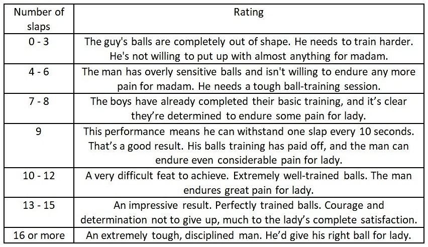 If the man moves, or perhaps grabs his sore testicles, the woman waits. As soon as he returns to the starting position, he receives another slap. It is important that the slaps are really hard and that it is not easy for the man to immediately position himself for the next blow. The man's task is to endure as many slaps as possible within the allotted time. This tests his respect and determination to suffer for the mistress. At the same time, it verifies how effective his training has been. For every slap the man receives, he is awarded one point. If he positions himself in the starting position but dodges just before the slap lands, or partially dodges by moving, 3 points are deducted. The final points earned are tallied after 90 seconds, and you can immediately see how your man.